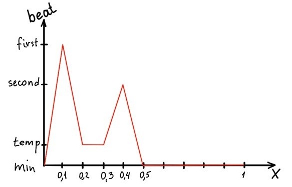 beat(t)=10⋅(temp−first)⋅x+2⋅first−temp